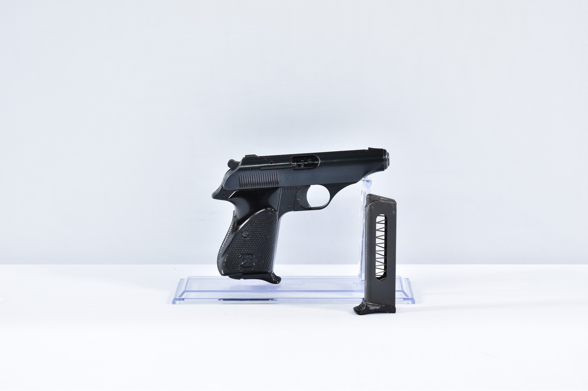 Diese Bernadelli 60 Pistole im Kaliber 7,65mm Browning hat eine Gesamtlänge von 16,5 cm und eine Lauflänge von 6,3 cm. Der Zustand der Waffe ist als 2 eingestuft, was normale Gebrauchsspuren, leichte bis mittelstarke Dellen und/oder leichte Kratzer an der Brünierung bedeutet, mit normaler Schussbelastung. Die Schäftung besteht aus Kunststoff. Die Pistole wird inklusive Originalverpackung, Putzzeug, Gebrauchsanleitung und einem Ersatzmagazin geliefert. Zudem weist sie einen italienischen Beschuss auf.