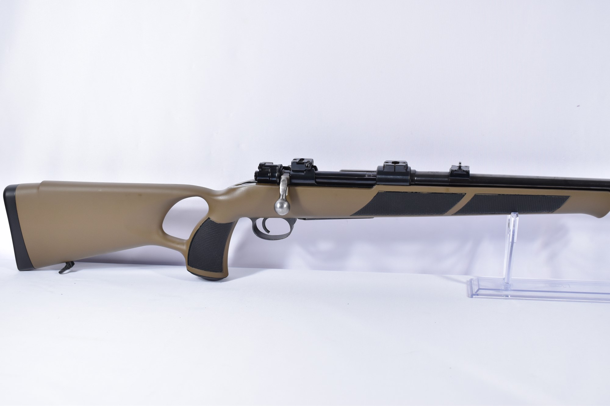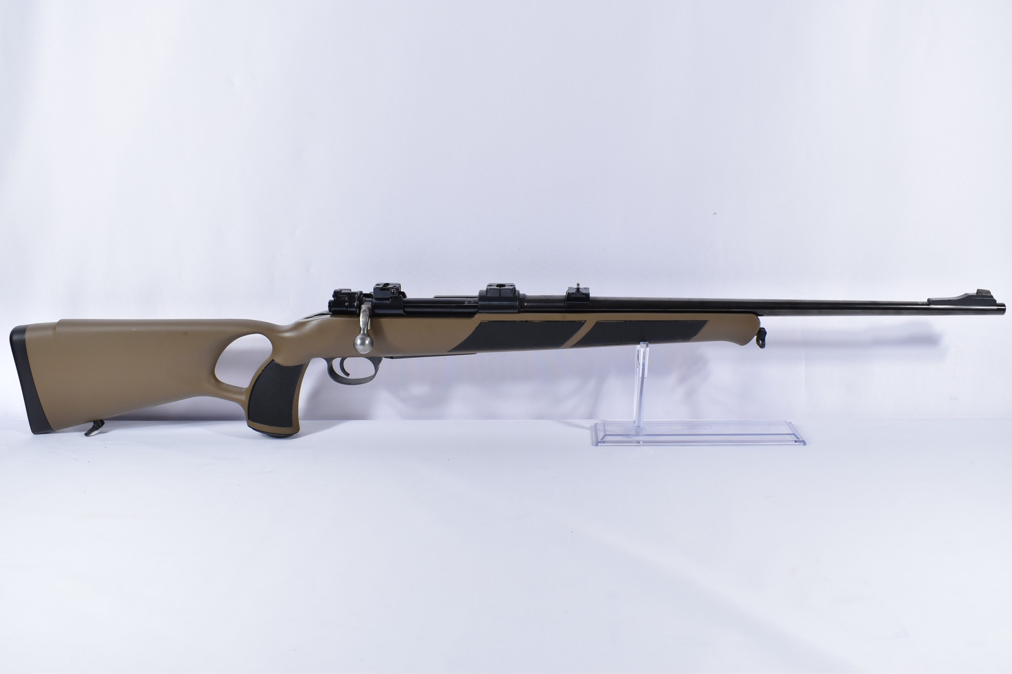Die Frankonia Brigant 8x57JS Repetierbüchse ist eine Langwaffe mit einer Gesamtlänge von 106,5 cm und einer Lauflänge von 53 cm. Die Schaftlänge beträgt 36,5 cm und das Gewicht 3,6 kg. Die Waffe befindet sich in einem Zustand 2, was normale Gebrauchsspuren bedeutet. Der Schaft besteht aus Kunststoff. Sie ist mit einer EAW Schwenkmontagebasis, Riemenbügeln, verstellbaren Kimmeblättchen und einem 98er System ausgestattet. Ein Umbau auf Picatinny ist für 180 möglich.