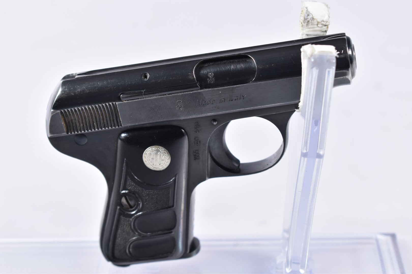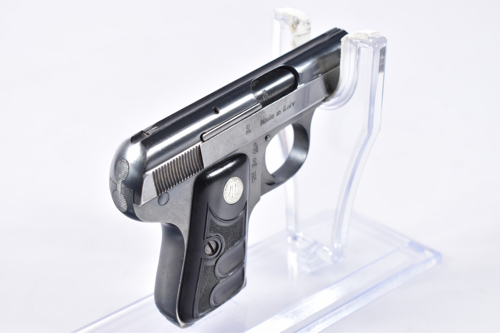 Diese Galesi Pistole im Kaliber 6,35mm Browning hat eine Gesamtlänge von 11,5 cm und eine Lauflänge von 5,5 cm. Sie wiegt 350 g und befindet sich im Zustand 3, was normale Gebrauchsspuren bedeutet. Die Pistole ist mit Kunststoffgriffschalen ausgestattet und verfügt über einen gültigen italienischen Beschuss von 1955.