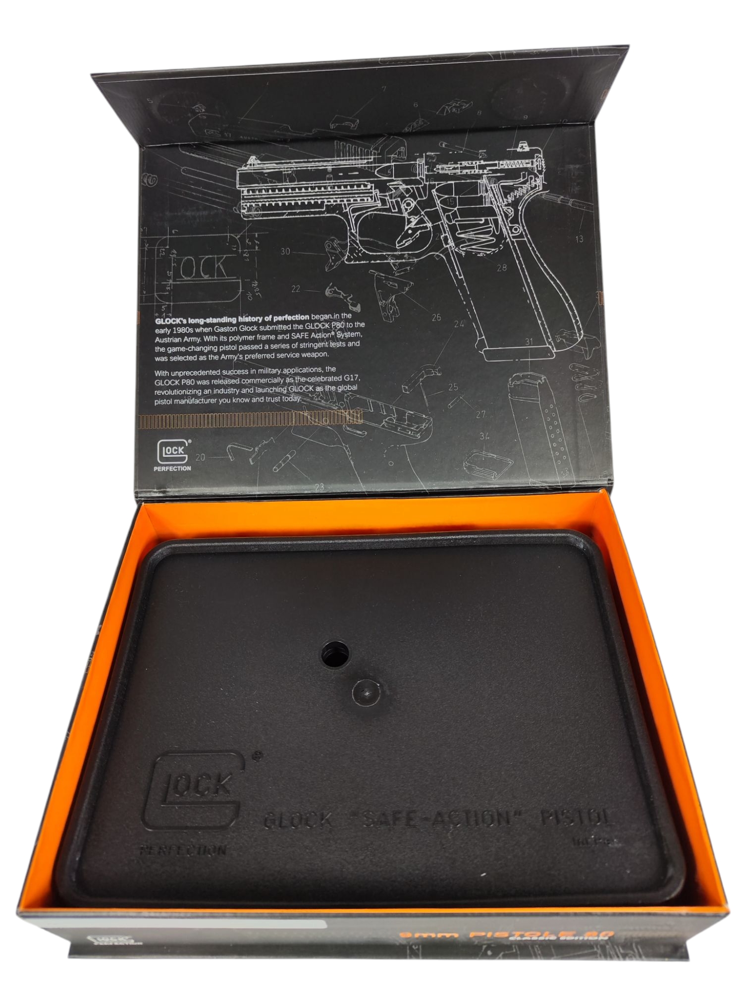 GLOCK P80 Jubiläumsmodell Eine wahre Legende kehrt zurück! Dieses exklusive Sondermodell ist eine Hommage an die ursprüngliche GLOCK P80, die in den 1980er Jahren speziell für das Österreichische Bundesheer entwickelt wurde. Mit ihrem innovativen Polymerrahmen und dem bewährten Safe Action®-System setzte sie damals neue Maßstäbe und übertraf alle Anforderungen der Armee. Schon bald wurde sie weltweit als GLOCK 17 bekannt und zählt heute zu den berühmtesten Pistolen der Welt.