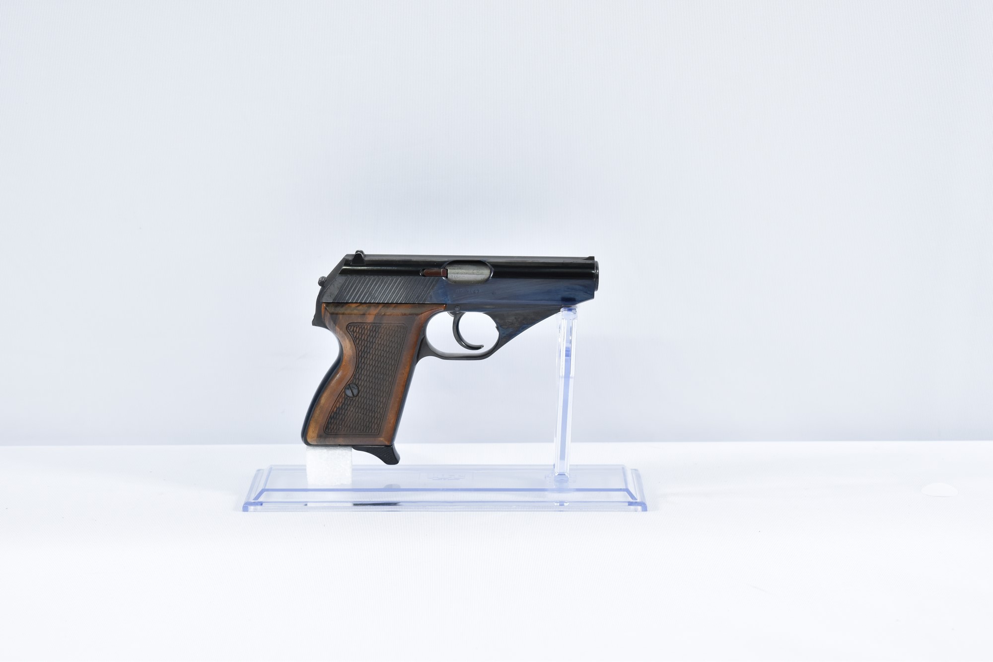 Diese Mauser HSC Pistole im Kaliber 7,65mm Browning hat eine Gesamtlänge von 16,5 cm und eine Lauflänge von 8 cm. Die Griffschalen sind aus Holz gefertigt. Der Zustand der Pistole wird als 2 bewertet, was normale Gebrauchsspuren und leichte bis mittelstarke Dellen oder leichte Kratzer an der Brünierung bedeutet.