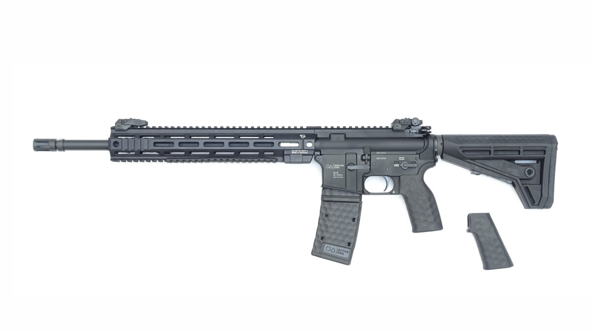 Das Gesamtgewicht von 3,4 kg (inklusive leerem Magazin) und die Gesamtlänge von 86 bis 94 cm (je nach Einstellung) machen diese Waffe gut ausbalanciert und komfortabel im Gebrauch. Besonders erwähnenswert ist der M-LOK Handguard, der eine flexible Befestigung von Zubehör ermöglicht. Der Waffenschütze kann auf den OA M4-Schaft und BUIS als Zielhilfen zählen, während der mitgelieferte OA Active Mag mit 10 Schuss die nötige Magazinkapazität für den Sporteinsatz bietet.