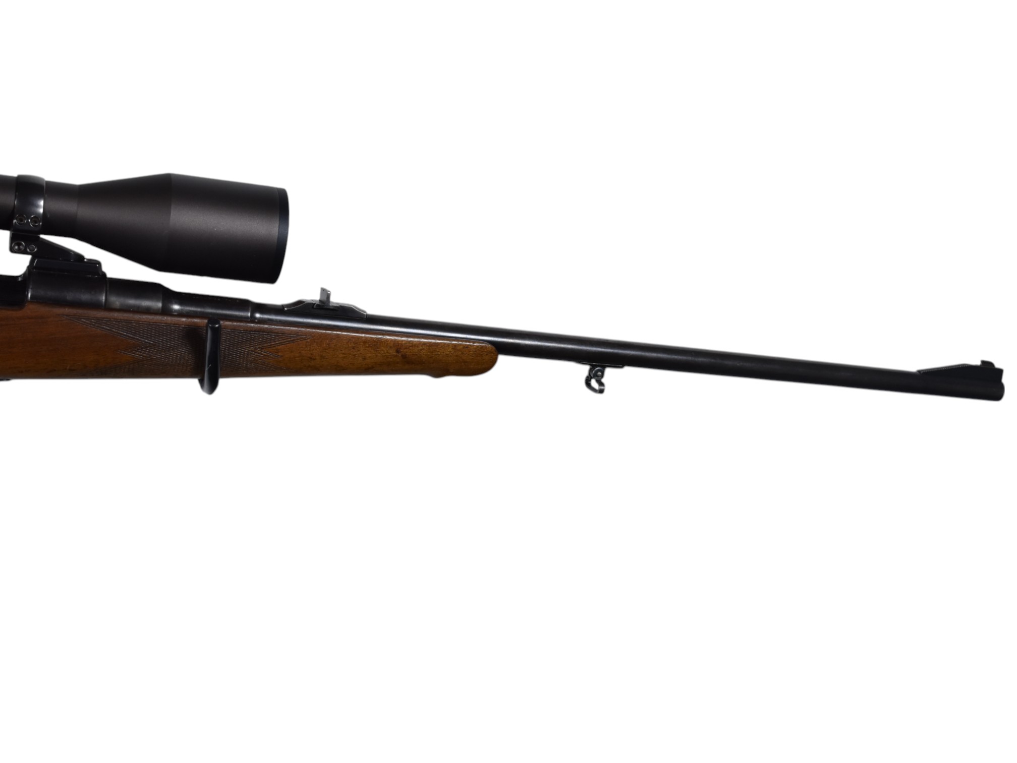 Diese Repetierbüchse im Kaliber 7×64 stammt von einem unbekannten Hersteller und ist mit einem Zielfernrohr Zeiss Duralyt 3-12×50 ausgestattet, das über eine Schwenkmontage montiert ist. Die Gesamtlänge beträgt mit Schaftverlängerung 115 cm und ohne Verlängerung 113 cm. Die Lauflänge liegt bei 60 cm, die Schaftlänge beträgt 35,5 cm. Der Abstand zur Schaftkappe inklusive Verlängerung beträgt 37,5 cm. Die Waffe befindet sich in einem Zustand, der mit Zustand 3 eingestuft wird. Das bedeutet, dass starke Dellen oder deutliche Kratzer an der Brünierung vorhanden sind in diesem Fall ist die Brünierung bereits sehr alt. Der Laufzustand ist hingegen als okay zu bewerten. Diese Zustandseinschätzung dient nur als generelle Orientierung es können weitere Abnutzungsmerkmale vorhanden sein, die nicht einzeln beschrieben wurden.