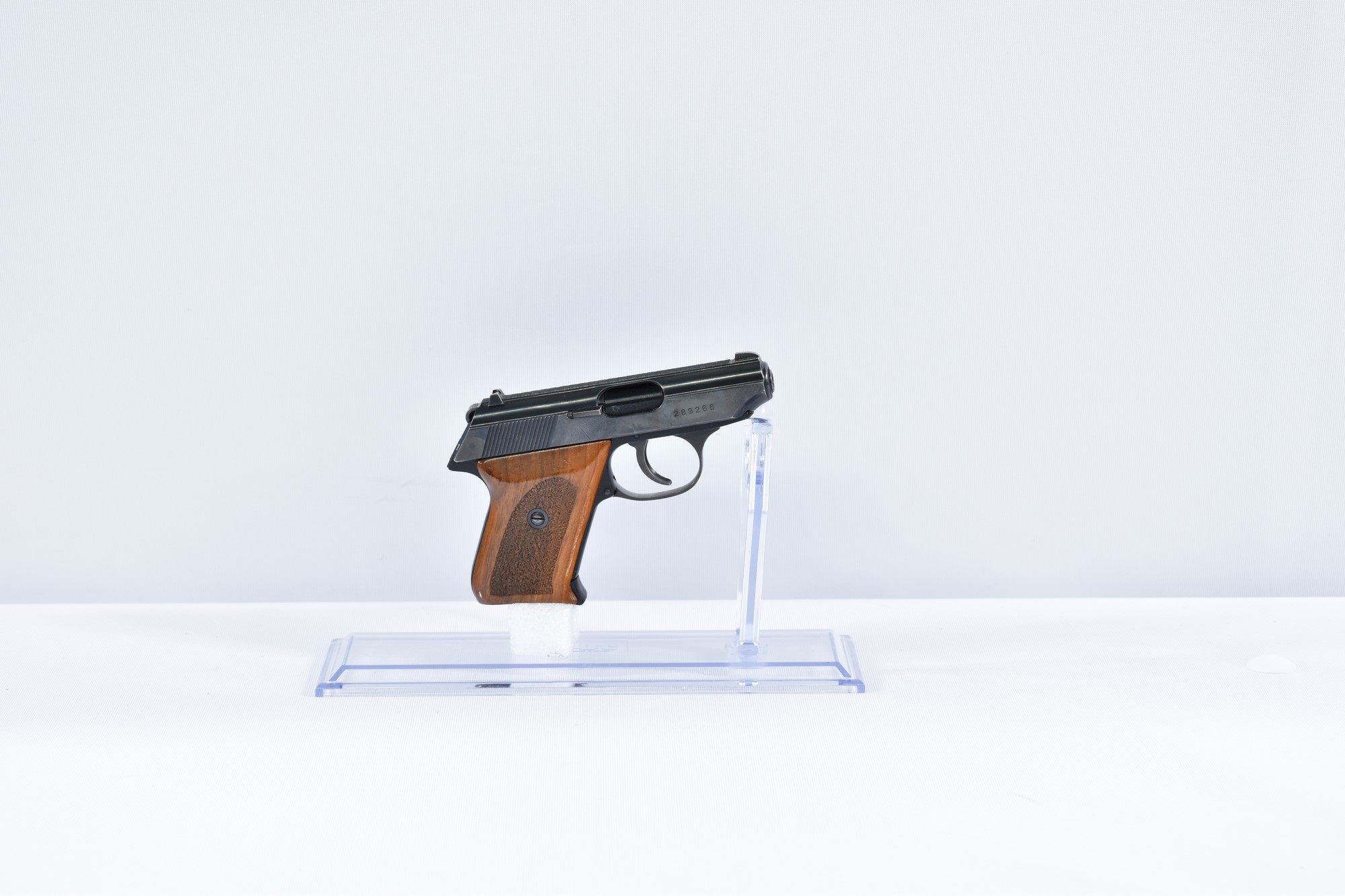 Diese Walther TPH Pistole im Kaliber .22lr hat eine Gesamtlänge von 13,5 cm und eine Lauflänge von 7 cm. Der Zustand der Waffe wird mit 1- beschrieben, was sehr leichte Gebrauchsspuren oder sehr geringe Schussbelastung bedeutet. Die Schäftung besteht aus Holz. Die Pistole bietet sowohl Single- als auch Double-Action-Funktionalität.