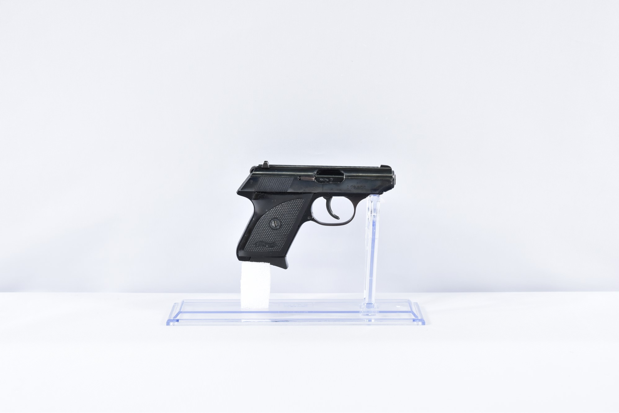 Diese Walther TPH .22lr Pistole hat eine Gesamtlänge von 13,5 cm, eine Lauflänge von 7 cm und ein Gewicht von 0,32 kg. Sie verfügt über eine Magazinkapazität von 6 Schuss. Die Griffschalen sind aus Kunststoff gefertigt. Der Zustand der Pistole wird als 3 bewertet, was starke Dellen oder starke Kratzer an der Brünierung bedeutet.